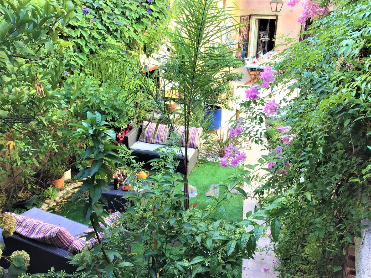 Les vastes chambres climatisées, décorées avec **élégance et raffinement**, offrent une luminosité exceptionnelle grâce à leurs grandes fenêtres et balcons. Profitez d’une vue imprenable sur la colline du château ou le jardin méditerranéen. Dès les beaux jours, savourez un **petit-déjeuner bio et fait maison**, préparé artisanalement, sous l’ombre des arbres parfumés.