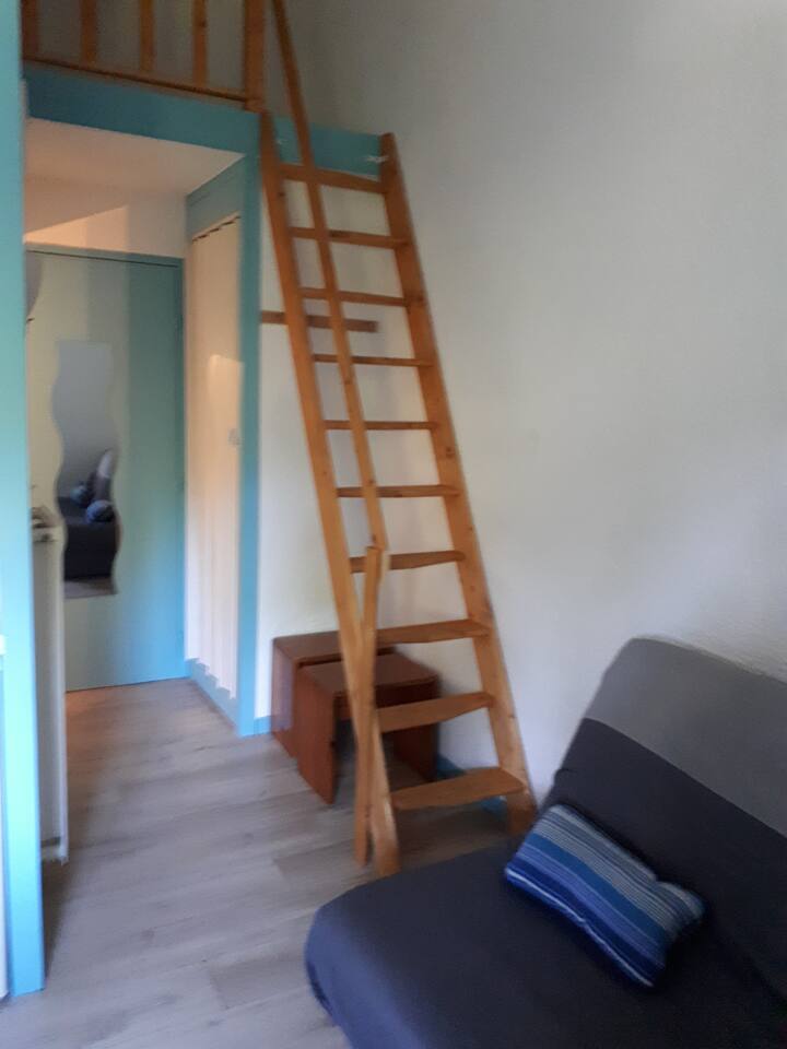 Avec une surface optimisée de 15 m² et une mezzanine, cet appartement classé **1 étoile** peut accueillir jusqu’à 4 personnes (1 lit double en mezzanine et un couchage supplémentaire). Parfaitement équipé et offrant une vue apaisante, il est adapté aussi bien aux couples qu’aux familles avec enfants. Vous apprécierez son calme, son aménagement pratique ainsi que sa situation privilégiée. **Le ménage est à la charge des locataires**, pour un séjour en toute simplicité.